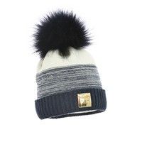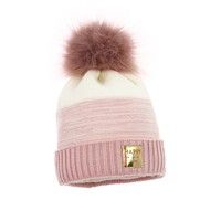 Stylowa czapka dla dziewczynki, możliwość skompletowania z kominem. Futrzany pompon i błyszcząca złota naszywka zdobi czapkę.