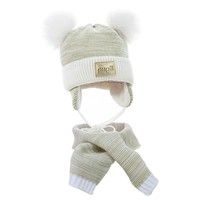 Komplet czapka z szalikiem dla małej dziewczynki zdobiony pomponikami z białego futerka i błyszczącą naszywką. wyprodukowana w Polsce OSTATNIE SZTUKI