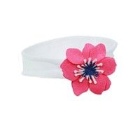 Śliczna opaska dla małej dziewczynki. Uszyta z delikatnej bawełnianej dzianiny. Ozdobiona ręcznie wykonanym kwiatem wykończonym małą perełką. Rozmiar S dla dziecka 0-6 m-cy, M - 6-12 m-cy, L - 1-3 latka.