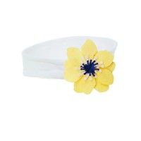 Bawełniana opaska dla dziewczynek. Świetny wybór na ciepłe, słoneczne dni. Uszyta z certyfikowanych, przewiewnych materiałów. Jej ozdobą jest urzekający, dwukolorowy kwiatek z frędzelków.
